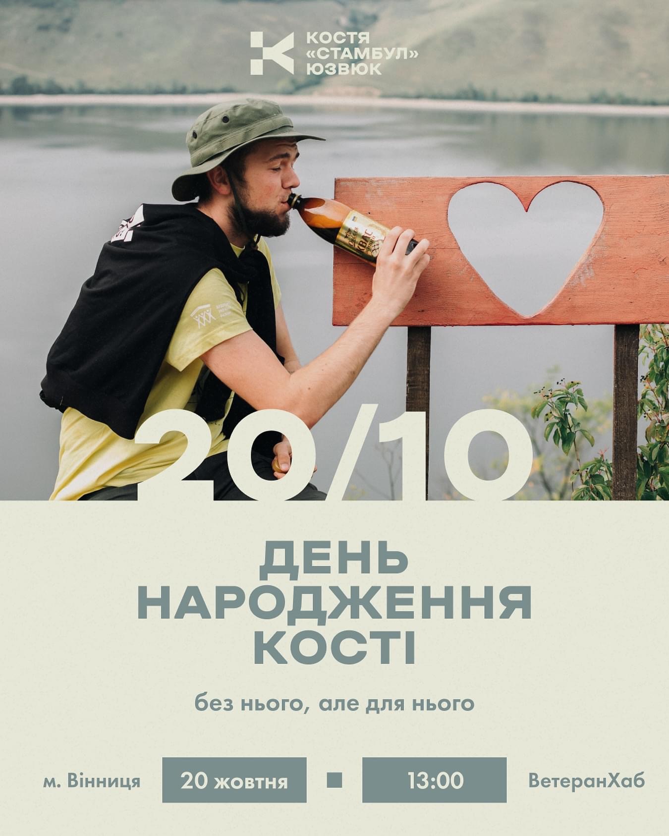 Тож, у неділю, 20 жовтня, з 13:00 до 16:00 год у Вінниці у Veteran Hub (вул.Славетна, 29) відбудеться День народження Кості. Далі у присутніх буде час на «погуляти й поїсти». Орієнтовно о 18:00 стартує публічний виступ відкритої території з якісною українською музикою "Співанка".