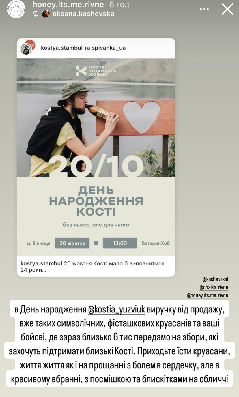 Тим часом, у Рівному в День народження Кості заклад "Мила, це я" передасть виручку від продажу фісташкових круасанів та бойові, де зараз близько 6 тисяч гривень, на збори, які захочуть підтримати близькі полеглого воїна.