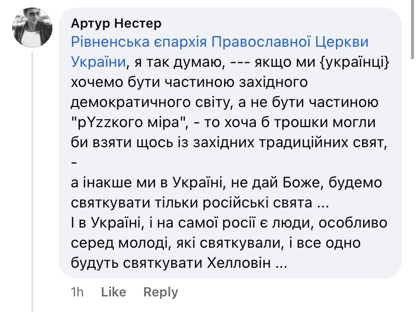 Тим часом, рівняни не згодні з висловленими словами церковників. У коментарях під дописом користувач Артур Нестер пише, що "якщо українці не хочуть бути частиною "рузкого міру", то треба хоча б трошки взяти щось із традицій західних свят".