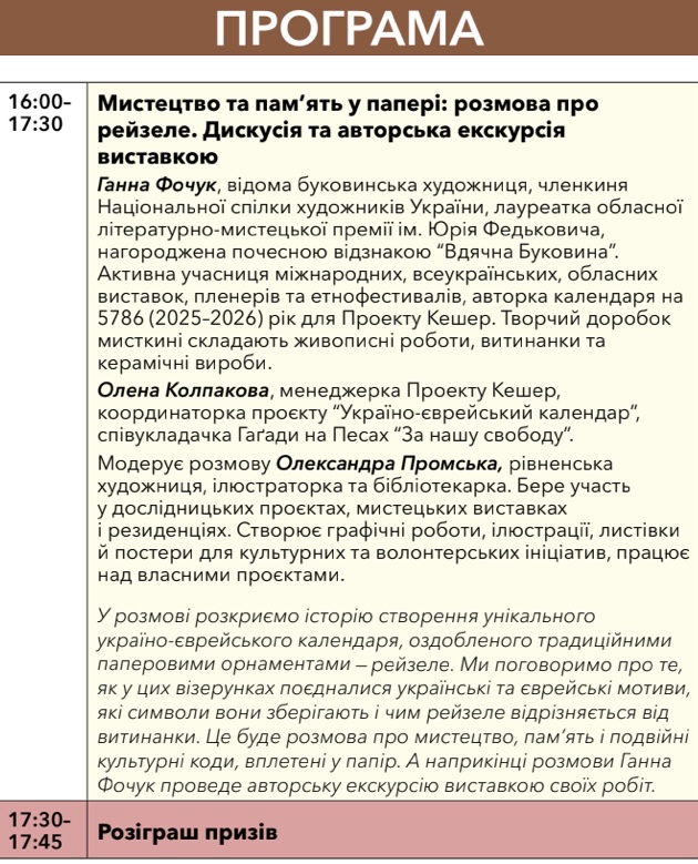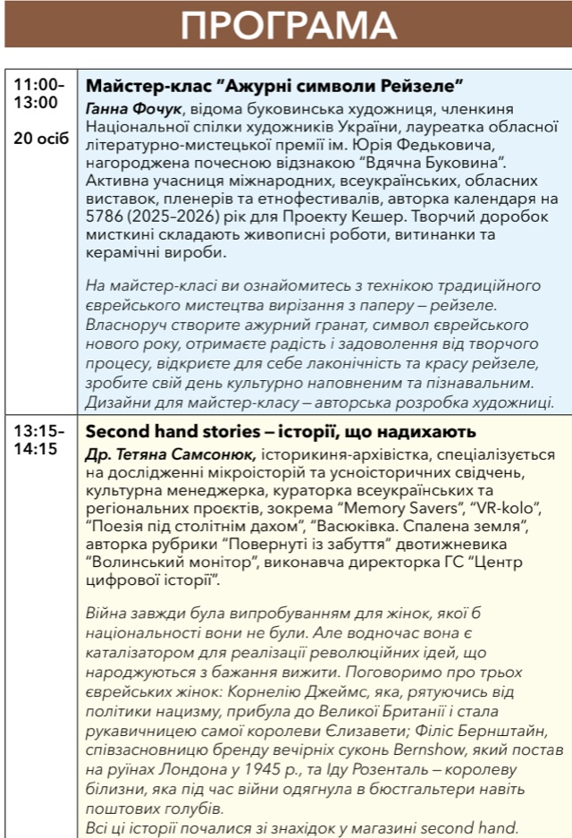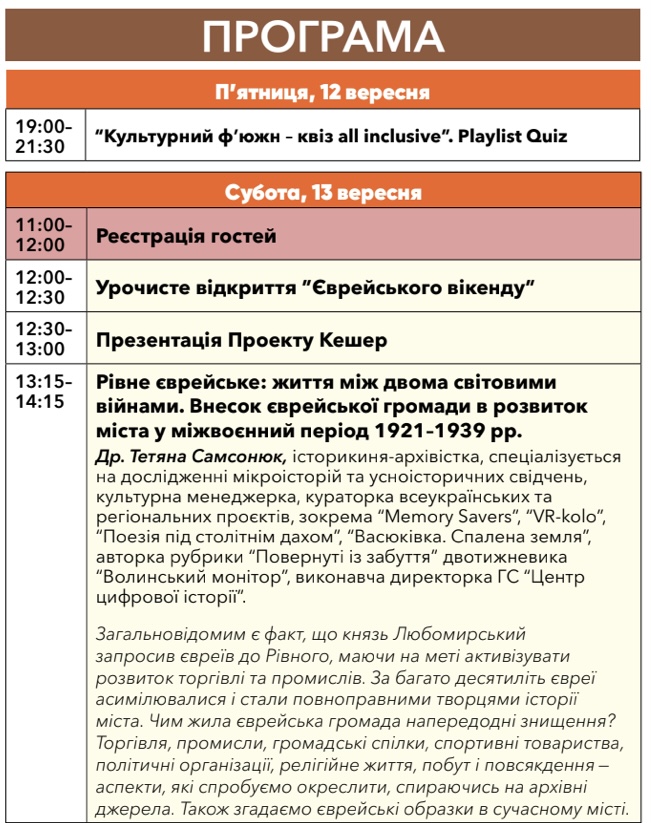 «Рівне – це шосте українське місто проведення «Єврейського вікенду» після Львова, Києва, Хмельницького, Вінниці та Чернівців. Тематичні події нашого Вікенду допоможуть зануритися у дослідження, як українська та єврейська культури історично впливали одна на одну, відчути ці перетини. Цей захід для всіх, хто цікавиться історією й вірить, що багатокультурність є нашим багатством і силою. На гостей чекають лекції, дискусії, майстер-класи, екскурсії, виставки, інтелектуально-розважальна гра, театралізоване дійство та приємні подарунки. Буде емоційно, творчо, смачно й атмосферно – кожен знайде формат собі до смаку», – сказала Влада Недак, директорка «Проекту Кешер в Україні».