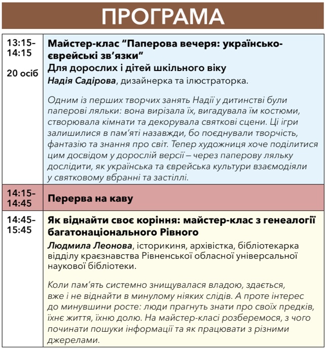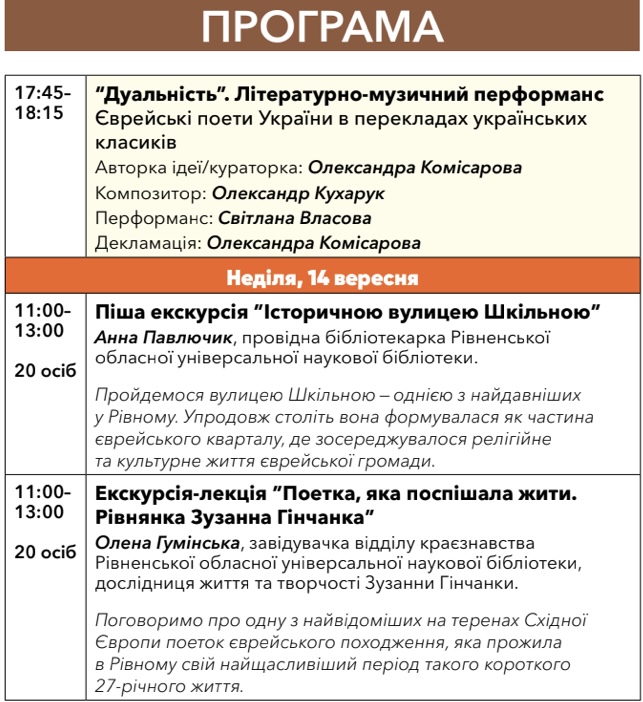 Цей захід присвячений взаємовпливам української та єврейської культур, який дозволить дізнатися більше про історію єврейської спільноти Рівного. Це унікальна можливість подивитися на місто по-новому та відкрити для себе його багатонаціональне минуле й сучасність.
