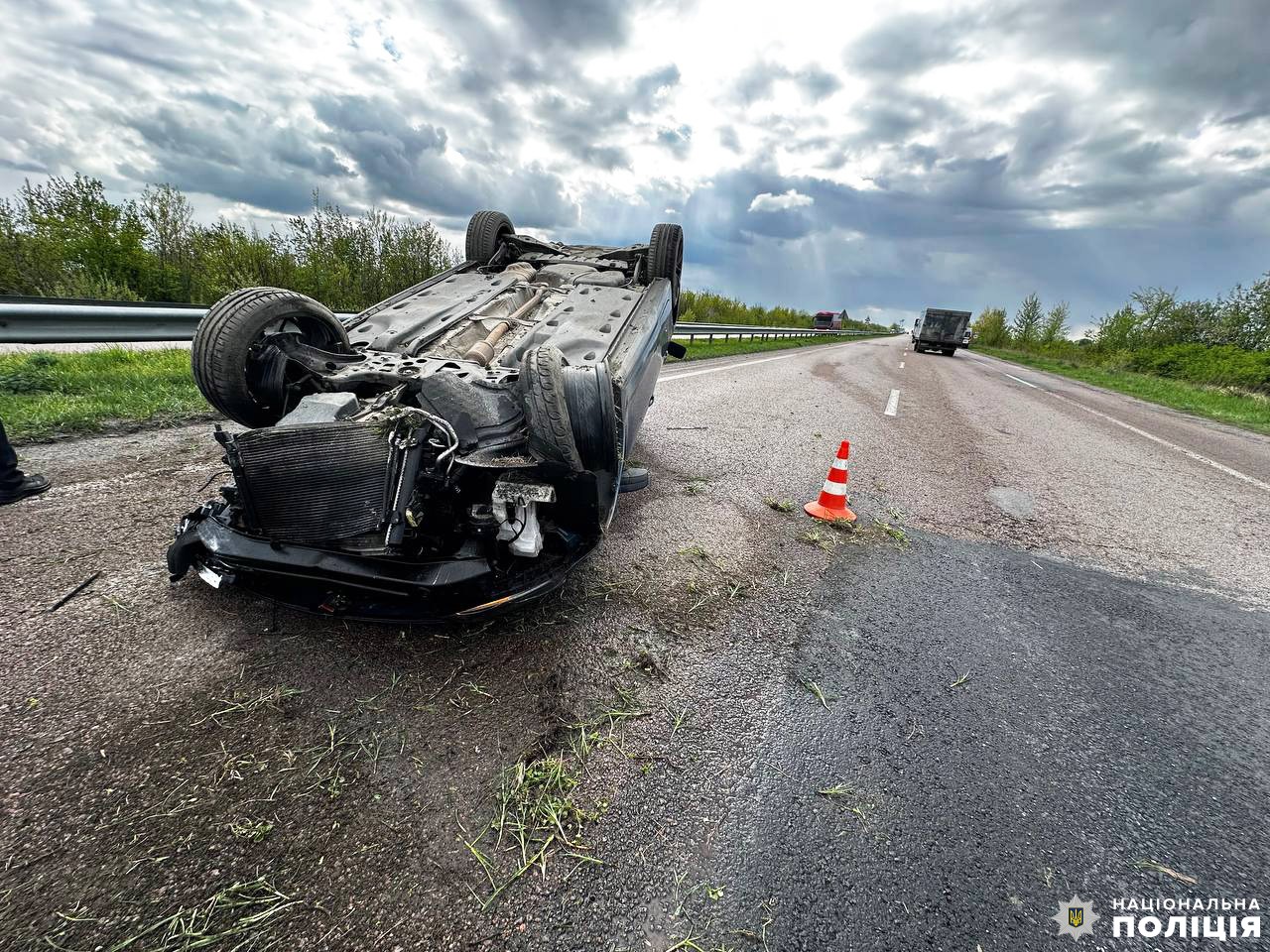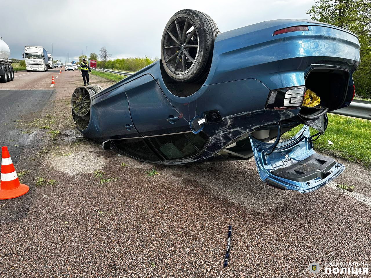 Попередньо відомо, що водій легкового автомобіля не впорався із керуванням та врізався у відбійник. Від удару авто перекинулось. Наразі відомо про одного потерпілого: керманича доставили до лікарні, де його обстежують медики.