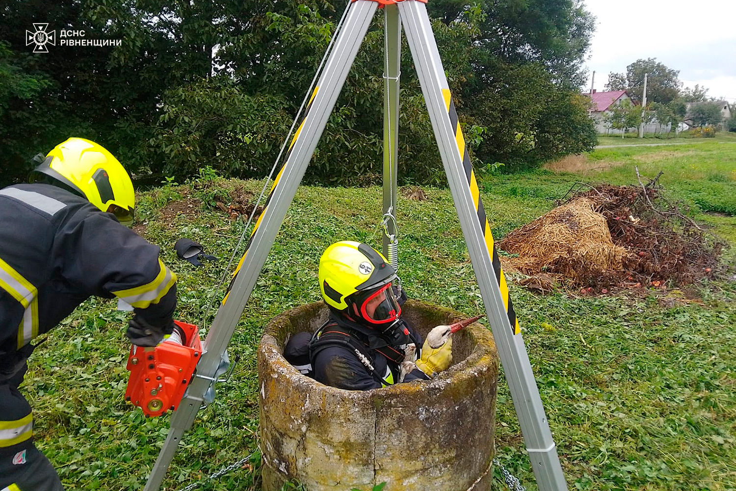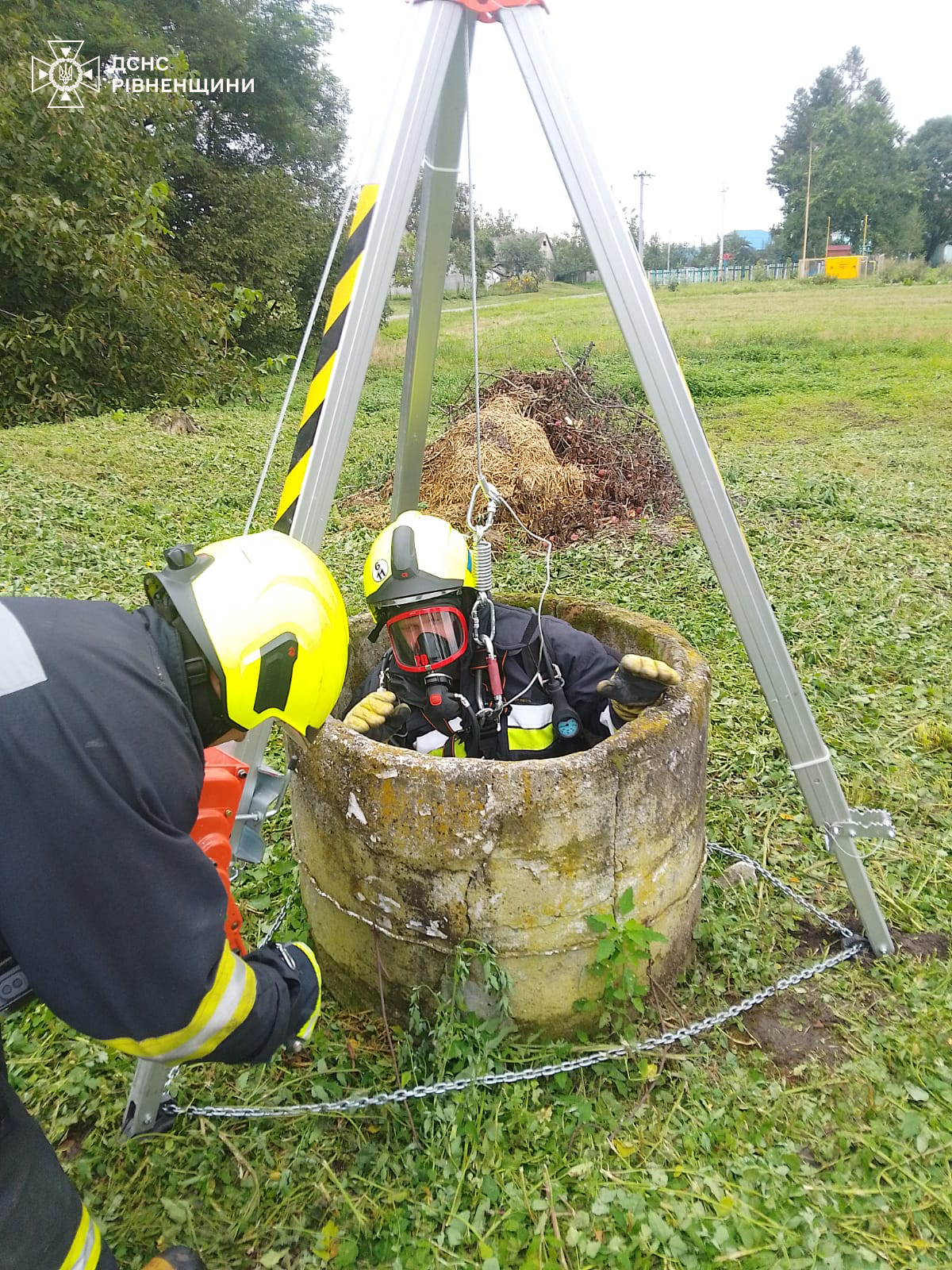 На виклик прибули млинівські надзвичайники. За допомогою рятувальної триноги з ручною лебідкою ДСНСники спустилися у колодязь глибиною орієнтовно 8 метрів та дістали птаха.