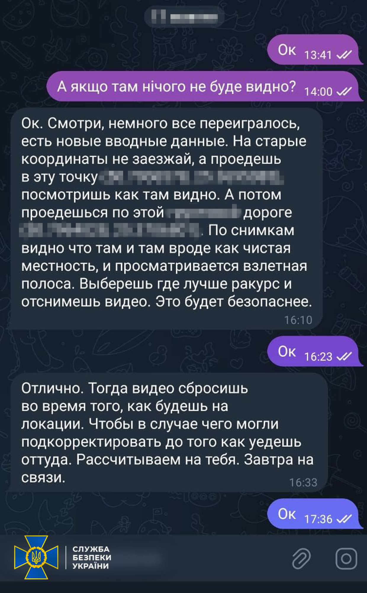 Щоб виконати це завдання агент на службовому авто об’їжджав місцевість під виглядом робочих поїздок та фіксував розташування військових об’єктів. Також він намагався виявити радіолокаційні станції та зенітно-ракетні комплекси ЗСУ для здійснення ворожих обстрілів «в обхід» української ППО.