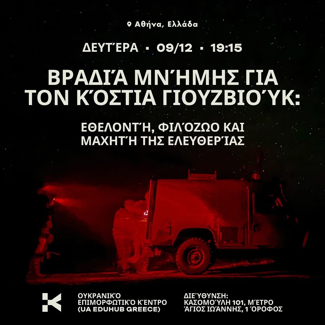 Так, у понеділок, 9 грудня, о 19:30 год за місцевим часом в Українському Освітньому Хабі (1 поверх; UA EduHub Greece, Kassomouli 101, Athina 117 44)