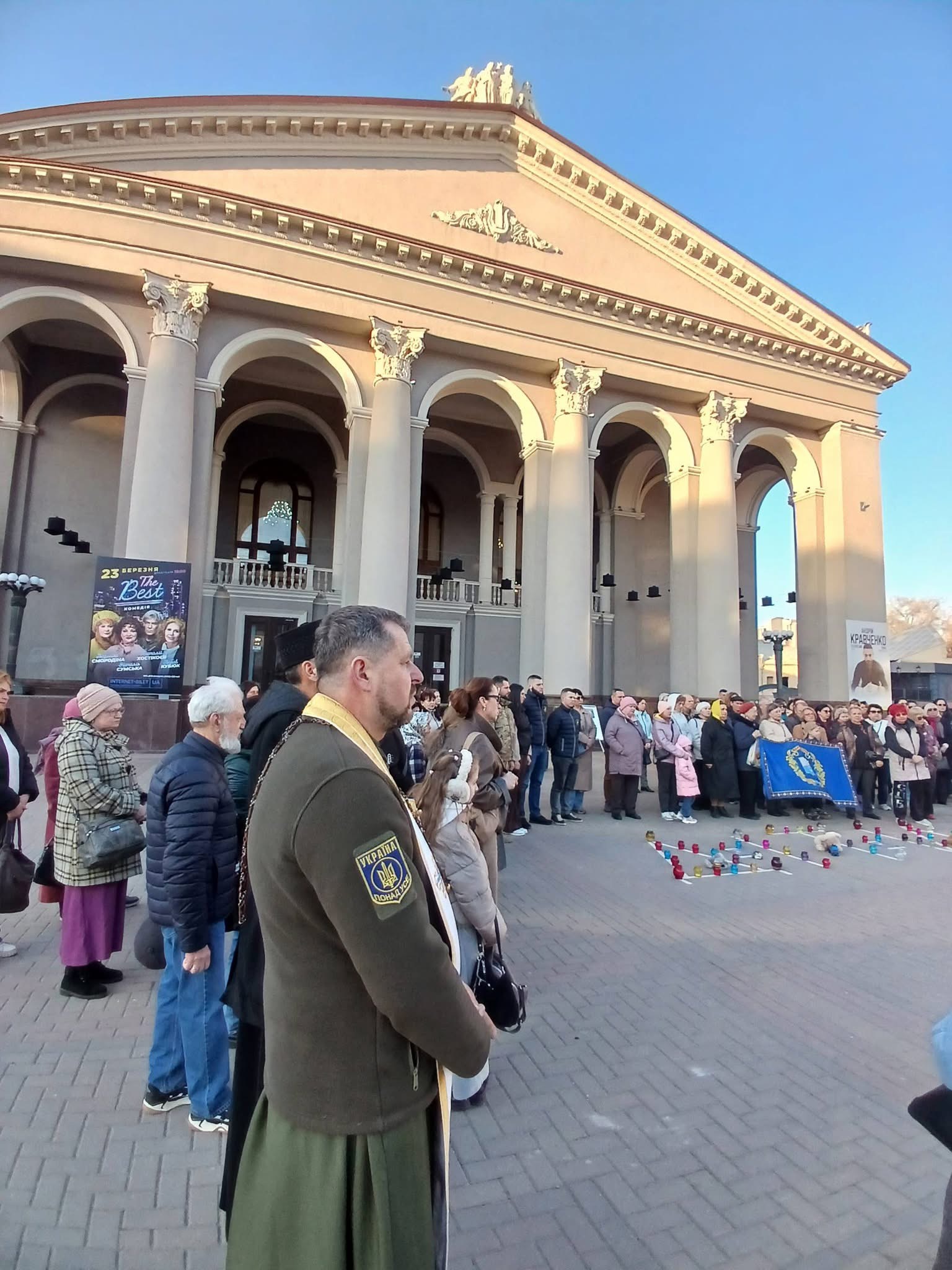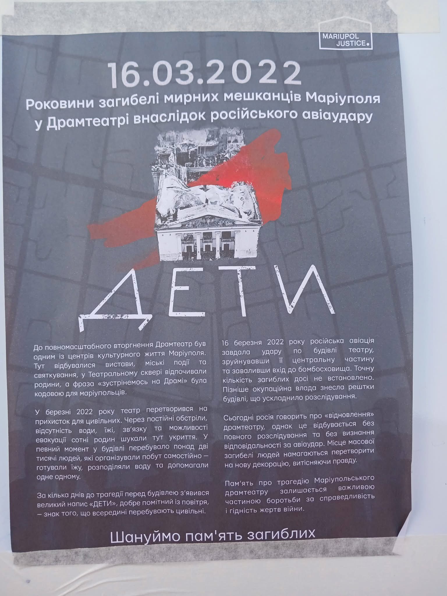 «Ми пам'ятаємо твою трагедію, Маріуполь! Твій театр, що став братською могилою твоїх синів і дочок, твоїх батьків і онуків. Сьогодні біля Рівненського театру відбулася тиха акція "ДЕ ТИ?". В спільній молитві за загиблими від російського авіаудару взяли участь і вихованці клубу "Хронограф" та члени Парламенту міста Палацу дітей та молоді».