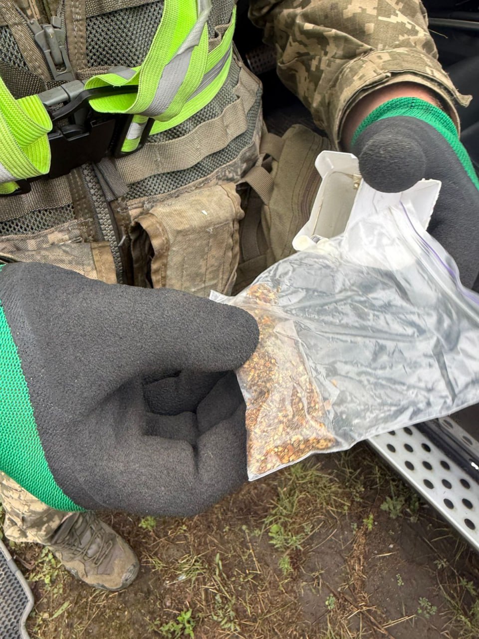За результатом ретельного огляду автівки під сидінням водія прикордонники виявили прозорий поліетиленовий пакет із сіро-зеленою речовиною.