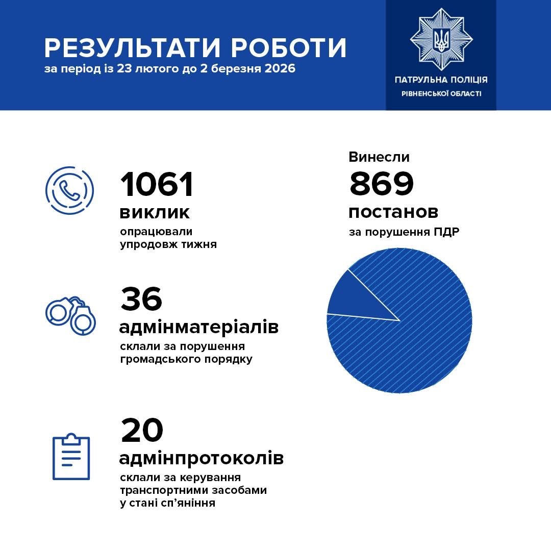 На Рівненщині за період із 23 лютого по 2 березня 2026 року патрульні зупинили 20 п'яних водіїв.
