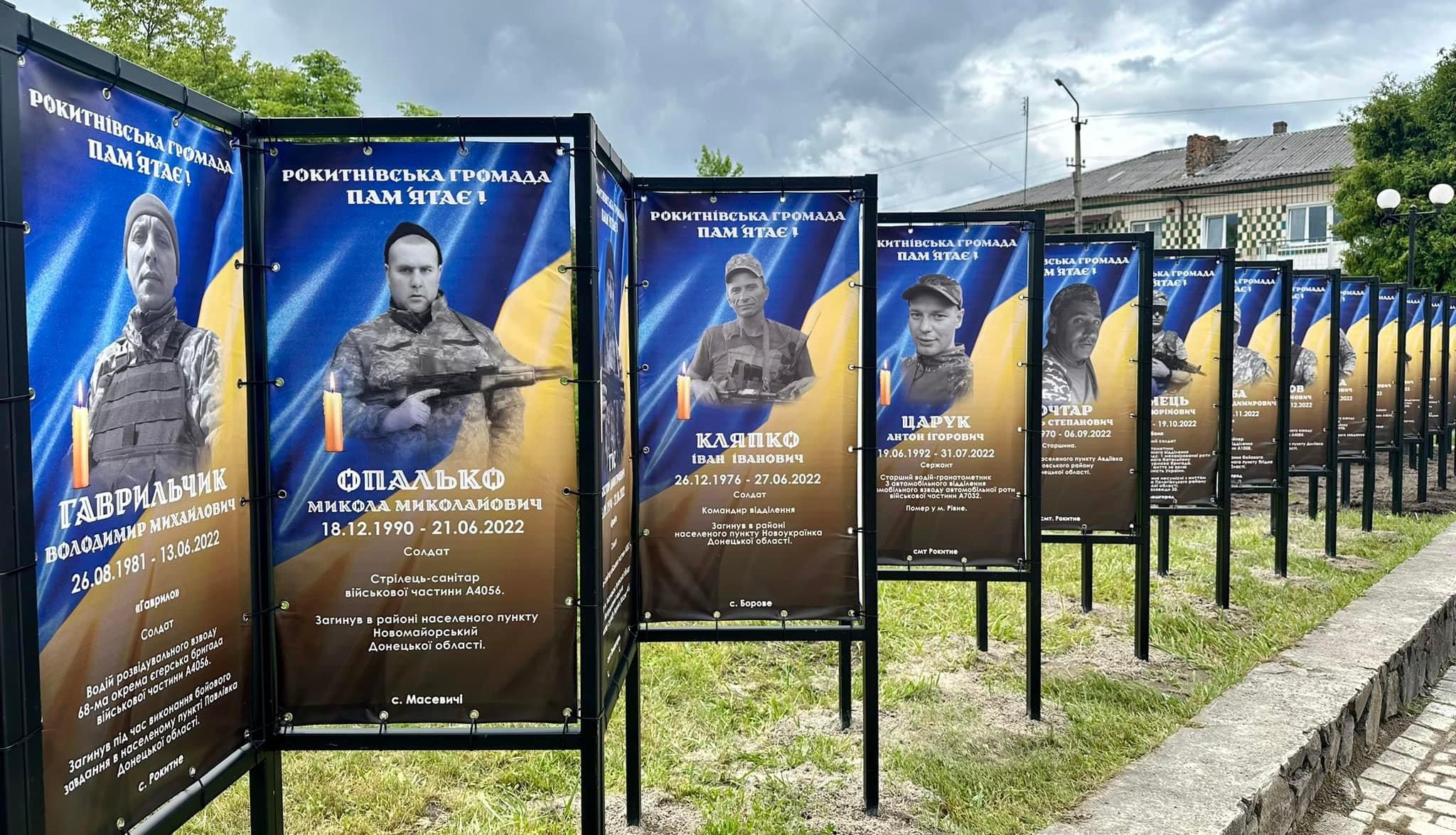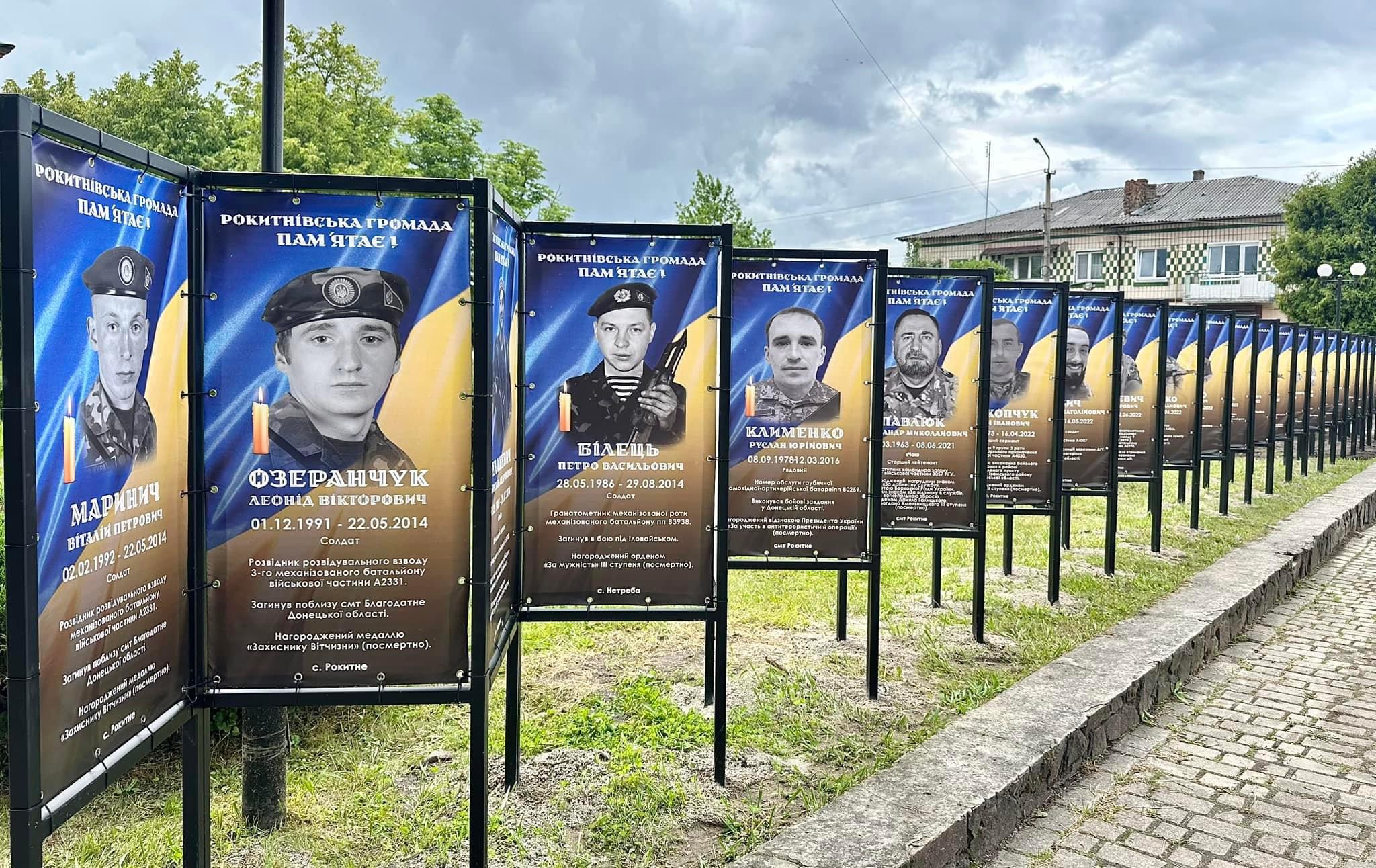 Банери із портретами полеглих у російсько-українській війні захисників встановили на площі біля адмінприміщення селищної ради.