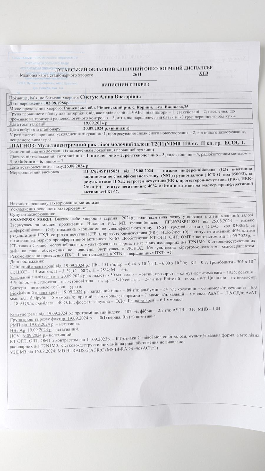Зараз жінка проходить курс хіміотерапії, попереду таких 8, а також ще оперативне втручання та променева терапія після хімії. Їй потрібні кошти на супутні препарати та підтримуючу терапію.