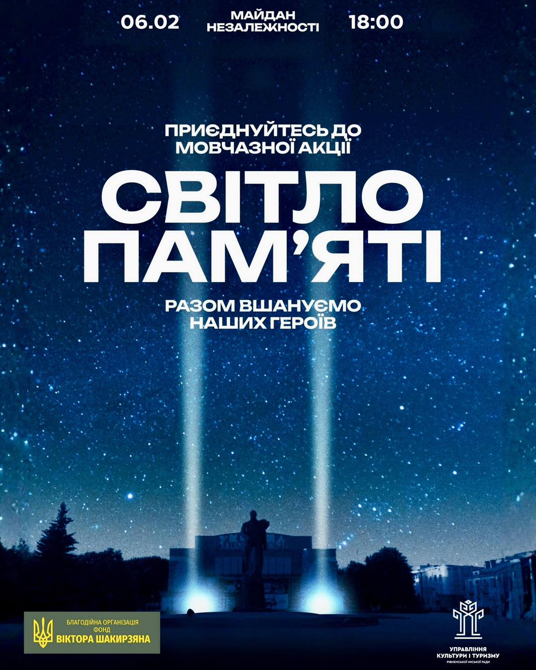 Вже завтра, 06 лютого, о 18:00 на майдані Незалежності у Рівному відбудеться мовчазна акція «Світло пам’яті». Так, біля портретів полеглих воїнів у небо здіймуться світлові промені – як символ вічної вдячності та шани.