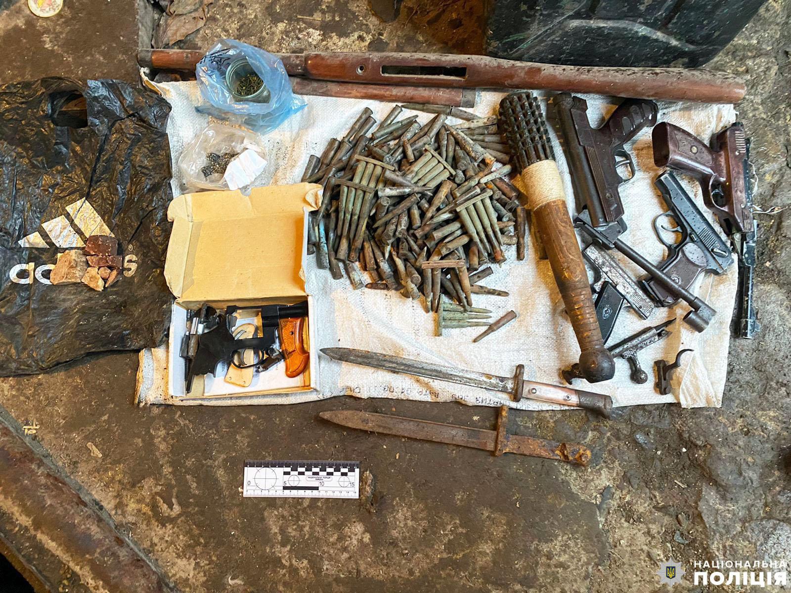 Під час особистого обшуку поліцейські вилучили у чоловіка пістолет, гранату РГД-5 із запалом дистанційної дії УЗРГМ-2 та саморобний кистень, який відноситься до холодної зброї.