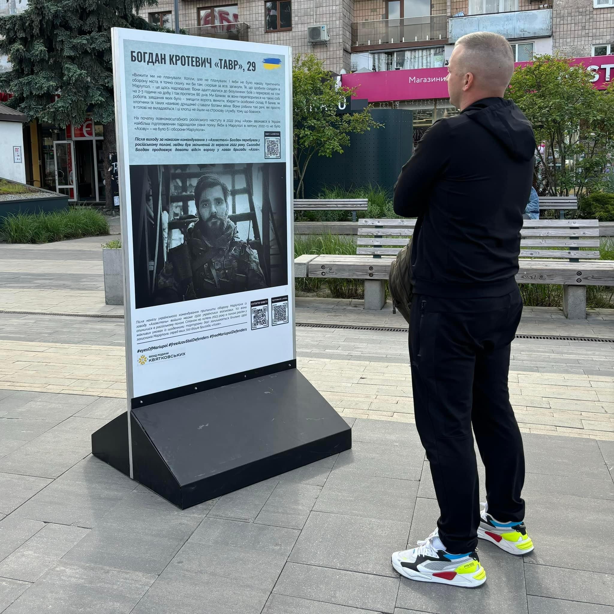 7 стендів виставки - фотографії, особисті листування захисників із рідними, спогади, їхні мрії, фрагменти відео з мобільних телефонів - взяті з матеріалів книги «Очі Маріуполя» української авторки Анастасія Дмитрук.