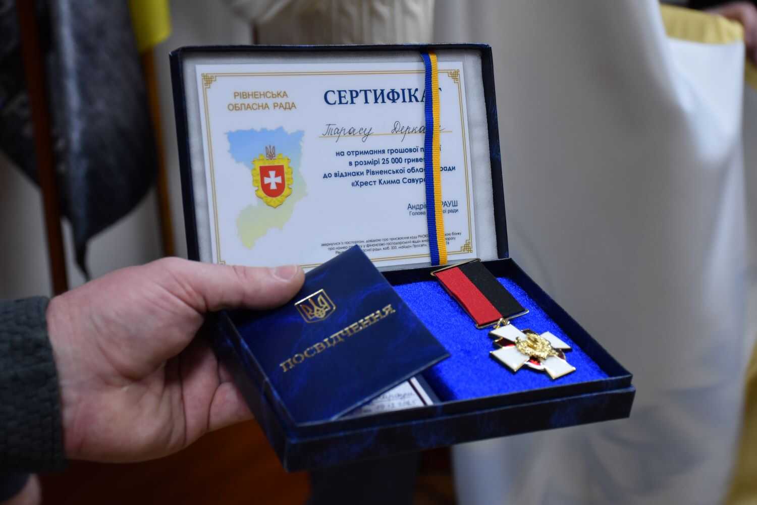 Рішення щодо присвоєння військовослужбовцю «Хреста Клима Савура» було прийняте на пленарному засіданні сесії Рівненської обласної ради 19 грудня торік. Тоді Тарас Деркач перебував на службі. І лише сьогодні випала нагода особисто вручити захиснику цю нагороду. До неї додається грошова премія в розмірі 25 тис. грн.