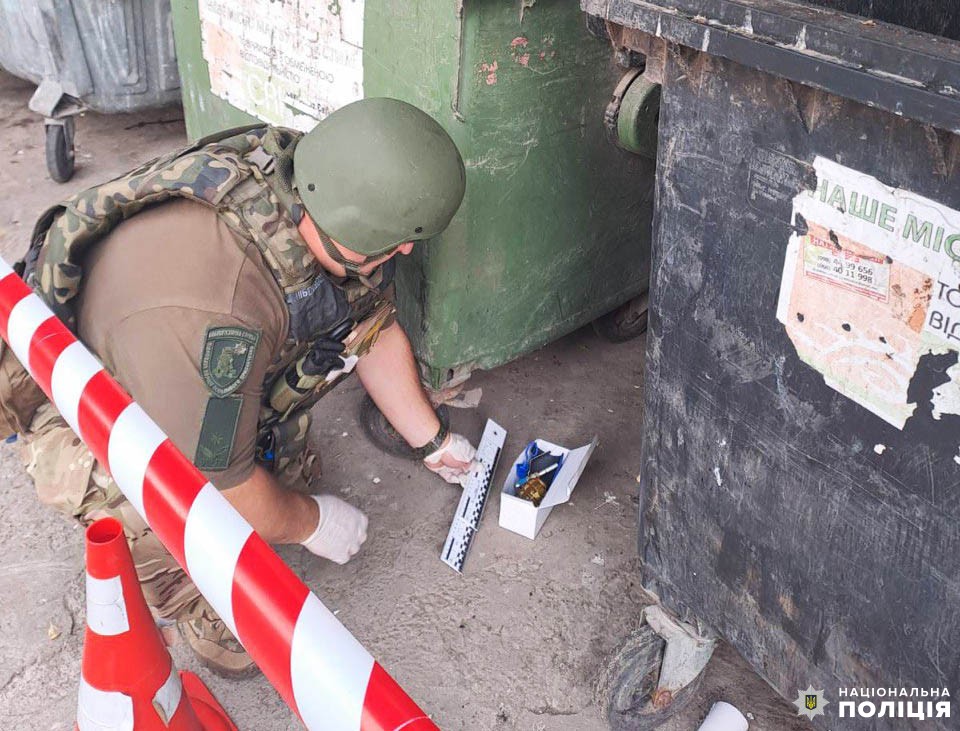 Прилеглу територію поліцейські огородили та розпочали огляд. Фахівці-вибухотехніки встановили, що у коробці знаходився корпус гранати Ф1, а біля неї – запал.
