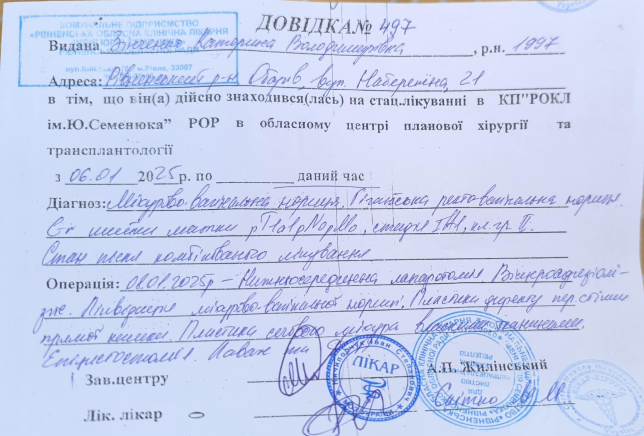 Катерина проходила лікування у Рівненському обласному протипухлинному центрі. Згодом після страшних больових нападів дівчина потрапила в Рівненську обласну лікарню, де й у неї виявили некроз статево-сечових органів малого тазу. Проблема торкнулася прямої кишки та шлунка. Поки що витрачені кошти на лікування не дали очікуваних результатів.